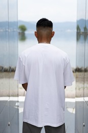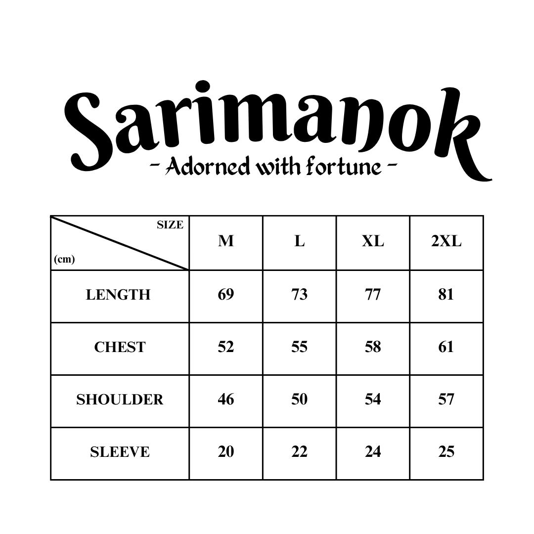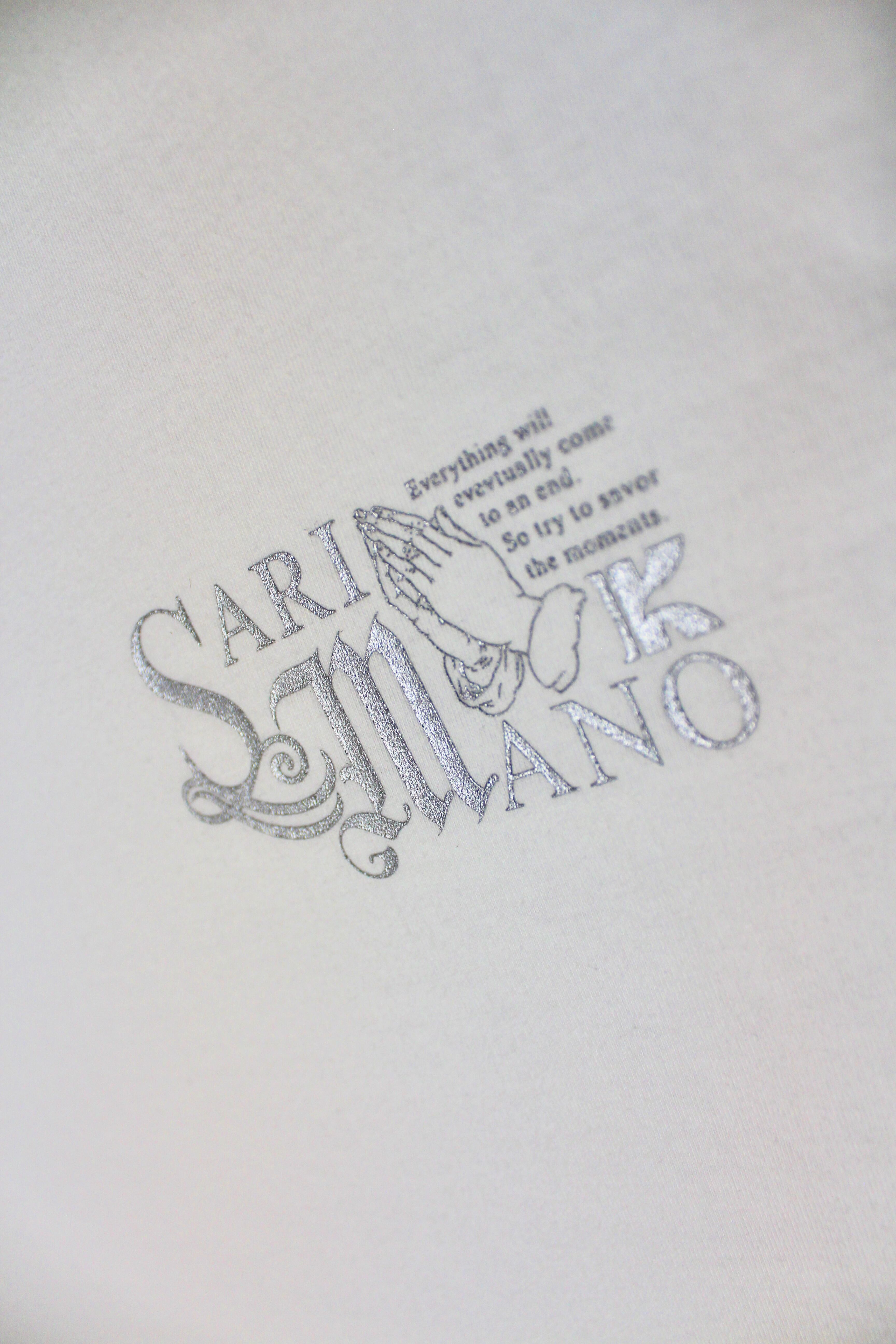 左胸にSARIMANOKストリート風のメタリックプリント、右下にシルバーグレーのスエードのピスネームが入ったTシャツ。